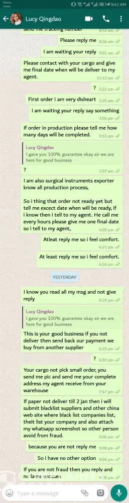 I give order to Qing dao paper company of 1000 DoubleA Reams, He gave me Proforma invoive and when i send TT Payment also give me all their braches proforma which is shown in my full whatsapp chat. Miss Lucy is sale manager of this company. When i transfer Payment then she said 2 to 3 days order ready but now she told me order is too small that our cargo...
