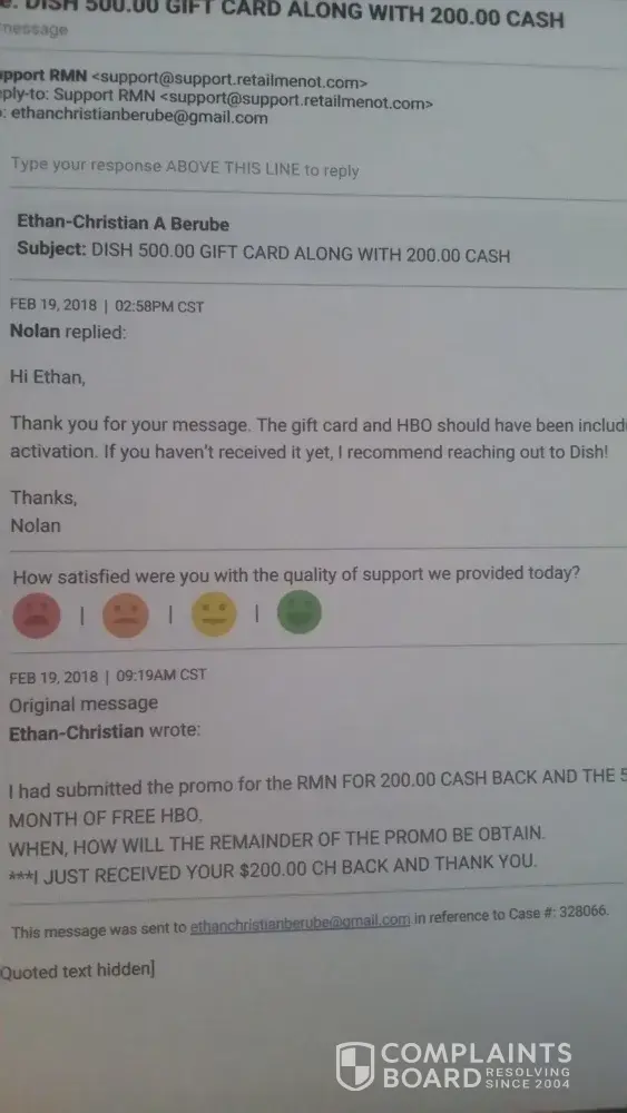 I aquire services through rmn for a dish network program. The product code vcd0018724559 which offered $500. 00 gift card and free hopper service etc. Now I received your end of $200.00 cash back.in several contacts with rmn they stated it was a rogue add placed on its site? How can a rogue ad appear on your site? And more importantly your not going to offer what the ad states from your site. Dish states it is not their responsibility for the ad on your site.