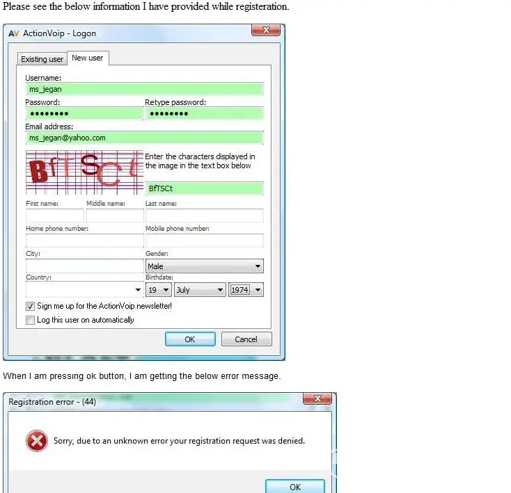 "Sorry, due to an unknown error your registration request was denied".