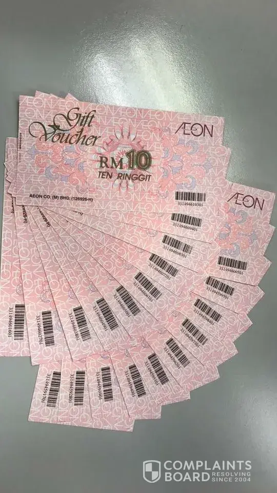Kindly refund/replace my Aeon vouchers (RM30 worth) else I will have to escalate the matter to the relevant authorities.