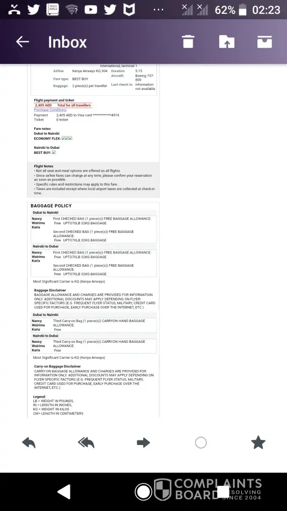Booking reservation. I booked my ticket online and I paid for it on 7th July. It said two checked in luggage upto 32 kg. But when I arrived at the checkin counter it was so shocking that they insisted its only 23kg even after showing them my ticket they still refused and said i should complain to Kenya Airways. Since i had paid too much for that ticket and i couldn't miss my flight. I just had to repack my bags quickly and throw them extra kgs i had. Up to this moment i don't understand how that can be an errorI've always been booking tickets online. When it says 23 kg i pack the exact kilos. This time it send 32 kgand i packed 32. I am so