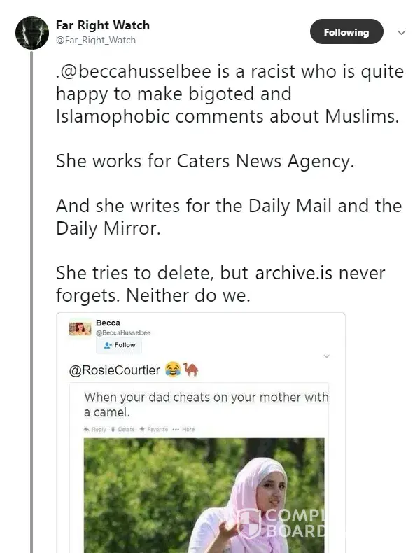 Becca Husselbee an employee at Caters News Agency is a racist who incites hatred towards Muslims.