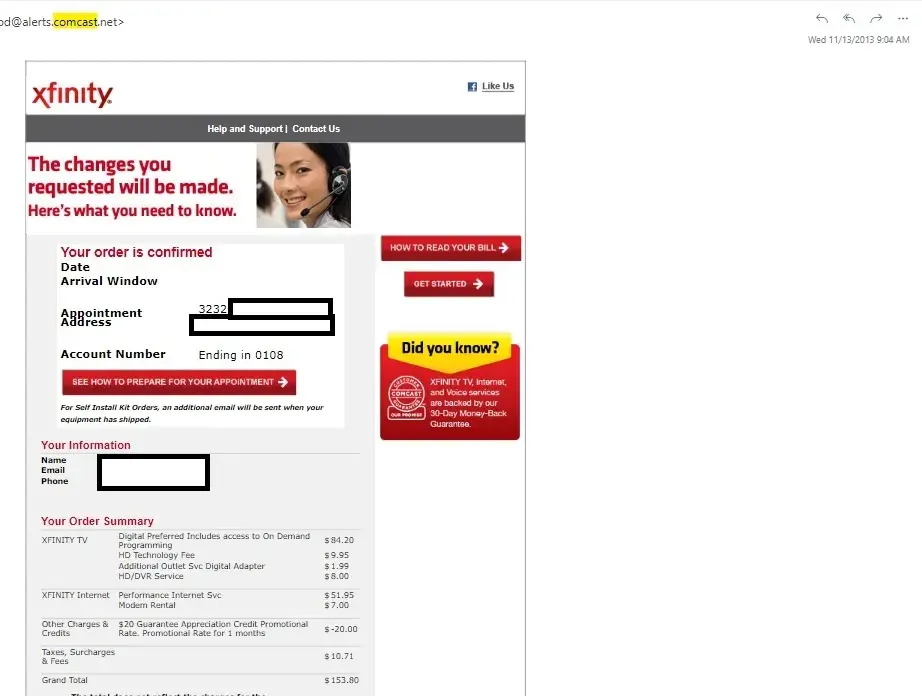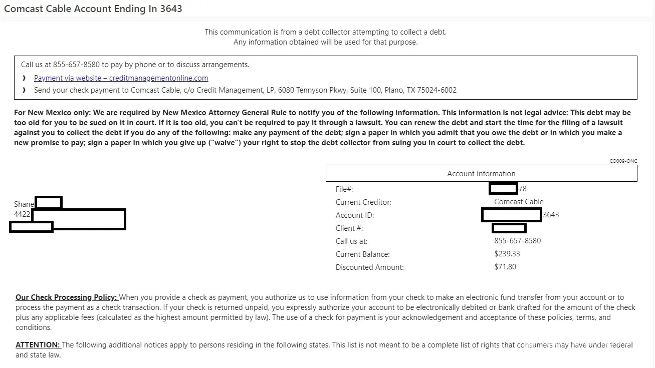 I've recently received two e-mail notices on an old abandoned e-mail address for an outstanding debt with Comcast.
