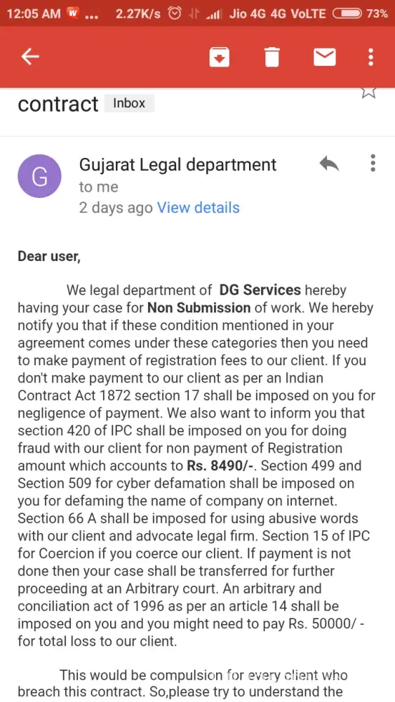 As on 3rd September 2018, I received an intimation mail from arju.[protected]@gmail.com who claimed to be the Advocate associate firm of DG Services. The mail was intimation for me to pay the dues towards the company or else they will be eligible to take legal action on me.