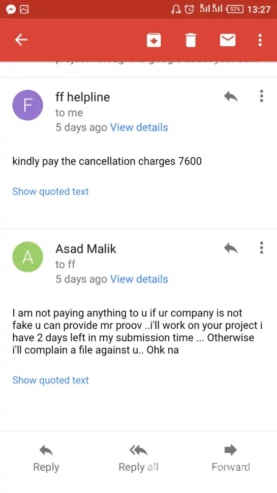 After a day the company replied me and ask for money.. Till now I neither recevd any call mail and msg from company but today a lawyer msg me and mail me and he demands money and give threats of legal procedure.