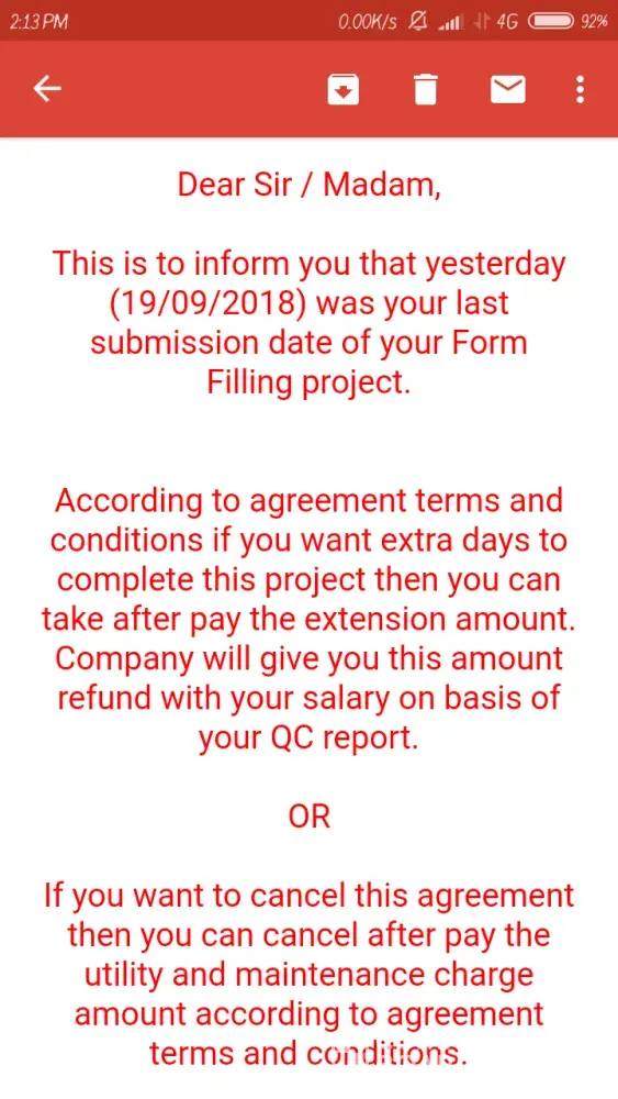 I have applied to part time form filling job through Online in DG Services company in Quikr site. I got a call from DG Services saying that if you are interested you can start doing the job. I said ok I will start doing the job. I got a mail from DG services about the license agreement and later I started doing the form filling work on September 1st, 2018. They asked me to send the scanned copy of any proof, so I sent them my Pan Card scan copy. They have given 3000 forms which I need to complete with in 15 days, cutoff forms is 2800. Deadline for completing the froms is 16th September, 2018. I have completed 1400 forms out of 3000 forms. But Due to some health issues I couldn't complete my form filling work. So I stopped doing form filling work from 12th September, 2018. After few days I got a mail from DG services saying that I need to pay money. They made many calls, but i didn't respond to their mails and calls. They have sent a text message to my phone saying if I didn't receive their calls then company will take hard actions against me. Later they called me, I lifted their call and they are demanding me to pay 7800 Rupees and said that If I didn't pay that amount I need to go to court. They have created fake license agreement using my full name. Again they sent a text message to my phone saying that "we will send you the notice Hard copy on your Residence Address. Do reply us within 2 days or call us on this number [protected] ". What should I do now? I can't pay any money as I'm from a very small family background.