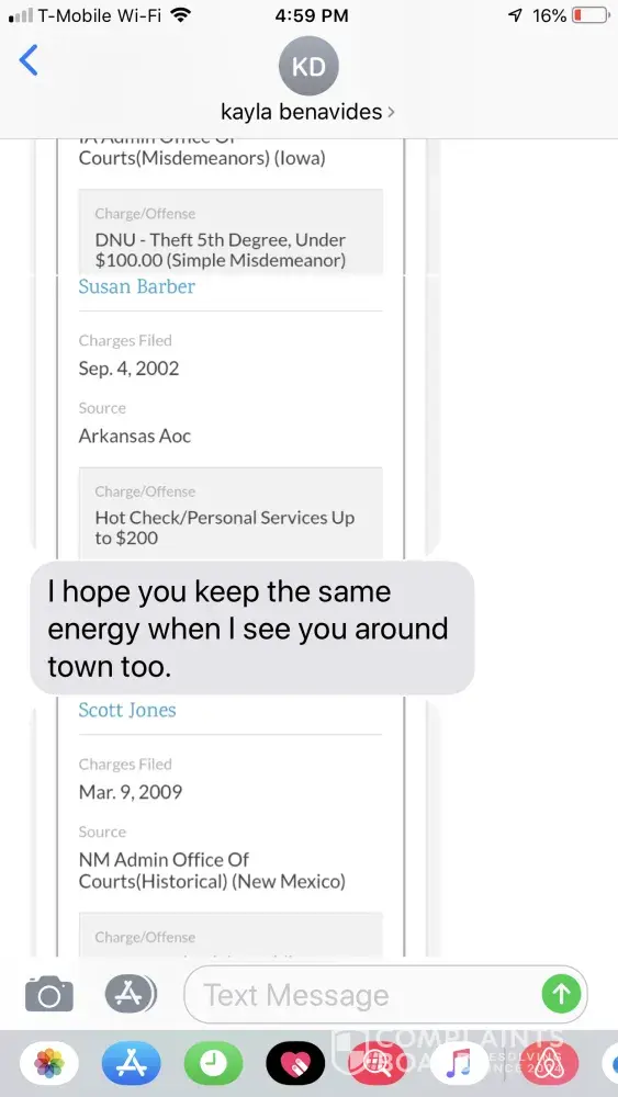 2) sent screenshots of people with our same names criminal charges from all across the country (not us) saying that she will use them to smear our hvac business.