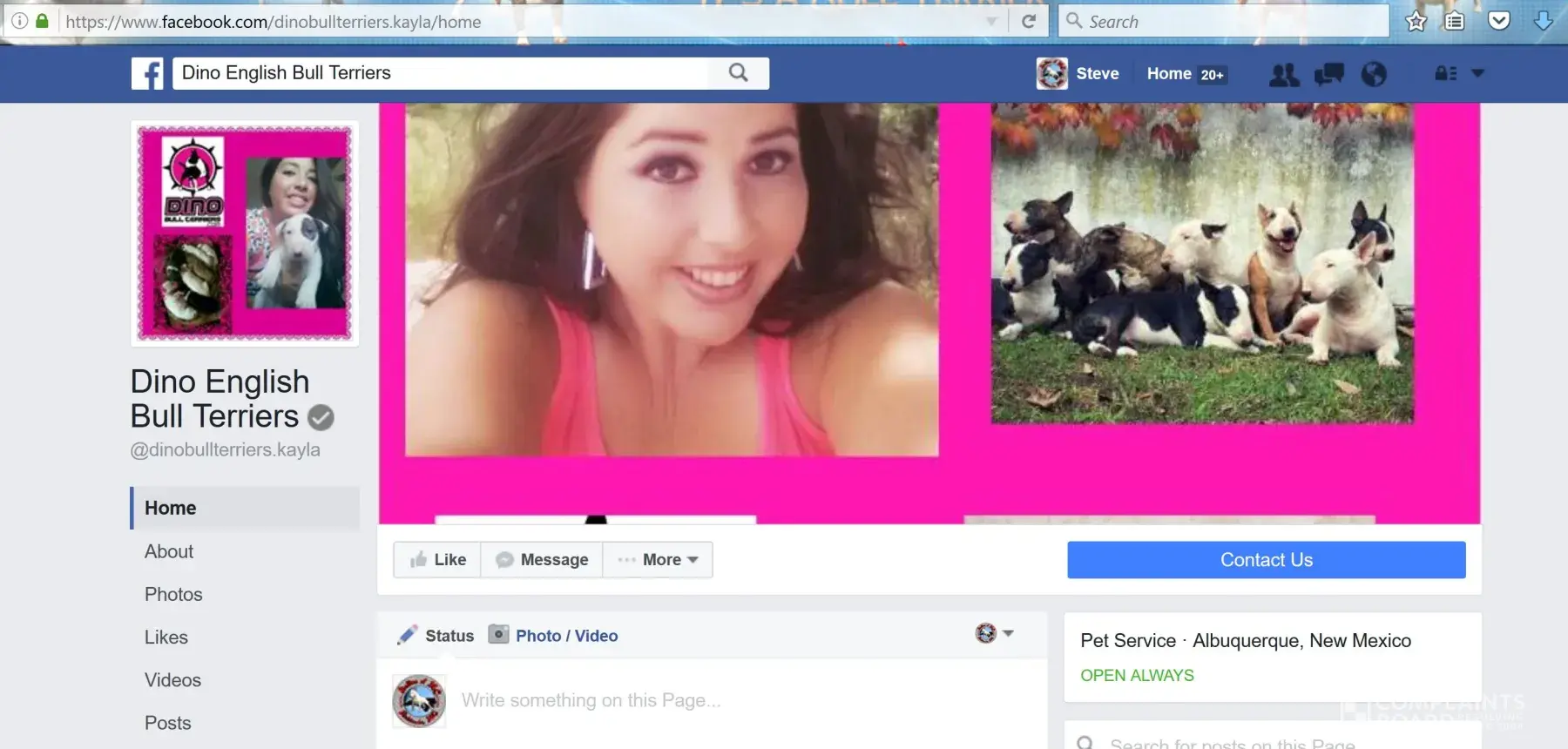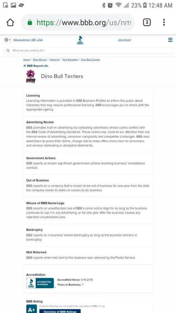 The person behind the screen is Susan Etta Barber age 50. She is the girlfriend to one of my former customers Scott Jones. More simply put she is not a customer of mine. I can't even believe I'm entertaining this review but you know what this type of story needs to be heard by anyone that comes across this review. So in 2016 I get a call from Susan Barber to chat about available puppies. She then goes on to waste hours of my time just to end up buying a cheaper dog from another breeder. I actually know who the breeder is and will not mention her name out of respect. She also had posts about the breeder on her social media saying that the dog she got from the lady had foreign objects in it's stomach and she was going broke taking it to the vet. She later removed those posts from her social media after Scott purchased a dog from me and I later confronted her about it when she started giving me problems. Keep in mind, around this time a competitor of mine decided to slander me online. My domain search was actually clean until that happened so this why you see Susan here following in my competitors footsteps because she is not a customer Scott was. Therefore, the BBB won't entertain her lies. Anyway, after her 1st initial contact in 2016 Scott waits 2 years to buy a puppy from me. During these 2 years Susan is following me on social media & Scott would message me off and on to inquire about available puppies. Eventually I get a call in June of 2018 from Scott Jones wanting to see a puppy I had available. While talking to him he expressed he had 2 bull terriers one a rescue and another from a breeder I mentioned earlier in this discussion. He also made in clear he was very experienced with the breed. While on the phone with him arranging the purchase, Susan is in the background yelling, " PUT HER ON SPEAKER PHONE I WANT TO HEAR WHAT YOU GUYS ARE TALKING ABOUT" her voice was not calm and polite when she said it either. She yelled it in a jealous dominating tone. This immediately should of been a red flag to me and I should of terminated the phone call right then and there. I will admit in the past I liked the challenge of these type of customers and would take them on simply to prove a point & when they had mentioned they were a little doubtful because they had ran into the forum my competitor wrote I kinda felt obligated to prove their doubts about me wrong. Anyways, Scott decided to buy the dog after continuing to low ball me in past inquiries through social media. He then invites me to his property in Rio Rancho NM. I get to the property & at that point was rudley greeted by Susan. She said nothing when greeting me instead she had this bitter look on her face. Also while I was at Scotts and Susan's place. They both drilled me with temperament questions the whole time. This confused me because as mentioned before they owned 2 bull terriers at the time. After answering numerous temperament questions, which my responses were not sugar coated, Scott then walks around aliasing the puppy while susan begs him to give me the money like some sort of child. He then tells her to " hold on it's in my pocket." At that point that's when I knew she was in fact not paying for the puppy. He then handed her the money to give to me. While counting the money, Susan is making side remarks that the puppy looked like a chihuahua. Again at his point I should of terminated the sale but nope. Again, I no longer deal with people like this anymore. People that belittle me in anyway will be asked to GO FIND ANOTHER BREEDER. Furthermore, the sale was later completed and I left. Not even 2 days later after selling the puppy Susan comments on one of my social media posts that the customer getting a dog shipped to Atlanta should, "come pickup the puppy instead." She also made sure to write the comment in all CAPITAL LETTERS too. I then blocked her from my social media. I also think it's rude when customers try to micromanage by business and I have found nothing good ever comes from these type of clients but extreme entitlement. Susan then emails me at 4am a week or so later saying " we need to talk. why did you block me off of social media?" I then ignored that email. I then get a call 8 months later while I had a litter of puppies from a lady by the Kathy Finley saying Scott had referred her to me because him and Susan were impressed with the quality of my puppies. I then sold to Kathy and she has not contacted me ever since with any issues. Days after Kathy took home her puppy, I get another email from Susan saying the puppy had aggestion issues, she wanted nothing from me, and wanted to keep the dog because she supposedly had it in training. She then goes on to demand how she wants me to stop breeding and has screenshotted all the siblings to her puppy from my social media. I then contacted Scott immediately but my text messages and calls went unreturned. I called Scott and not her because she was obviously not the one that paid for the puppy. So her allegations stated in this review that her attempts were disregarded is a lie. In fact, I had just texted scott days prior asking him how the puppy was and thanking him for the customer referral. Please reference the screenshot for proof. She then went ghost on me for 6 months until I got another email from her asking if a bull terrier she found was possibly mine. I then chuckled while reading the email and ignored it. It is now currently July 2019 and I get a notification from the BBB saying a customer left a review. I then go check my account and sure enough it's the devil herself Susan Barber. She left a review not a complaint 1year after Scott bought the dog saying I was unethical for not standing behind my aggressive breed. That review was never posted because the BBB found out she indeed was a lier. I knew I did nothing wrong to this women so I warned her that if the bbb decided to post the review I was going to do the same to Scott's business. I actually contacted sc