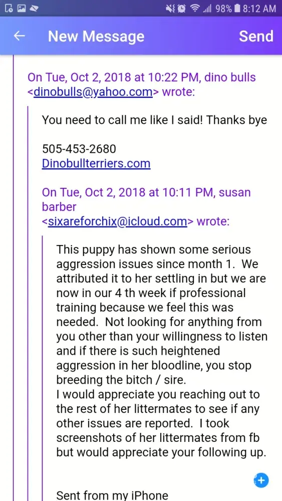 Gathered the emails Susan sent me. Notice I responded to all of them! Also notice Scott's not coming to me she is. It took her 4 months after I sold her this dog to notice I blocked her on Facebook. Then a month later after she notices shes blocked on Facebook she starts emailing me about aggression issues. Not a coincidence huh lol! Then she has failed to post proof of the training she claims the dog got on here. If anyone wants to see her criminal history in regards to this complaint please contact me!