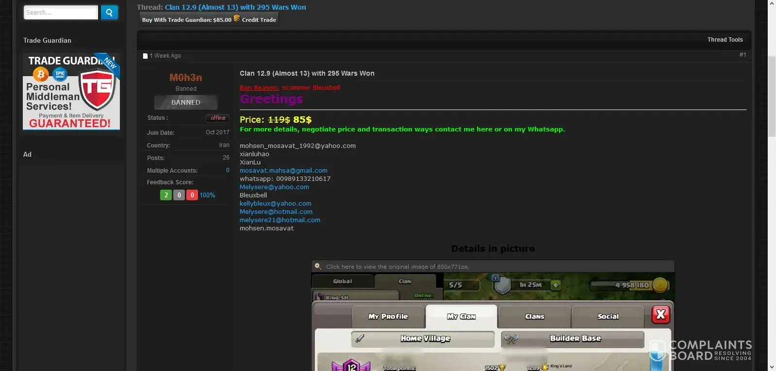 🛑 Completely useless mods, they dont care about you getting negative feedback that is an attack on you and nothing to do with the transaction unless you paid them to do a Trade Guardian transaction. All the individual has to do is show a picture that they bought or delivered an account, service, or whatever and that person can say anything and give you whatever feedback they want. Completely useless moderation team, they no integrity at all! I will never return after months of selling and buying with 100% positive feedback from many sellers and buyers, also I cant believe they even monetize their website when their service is so bare and completely unprofessional. I DO NOT RECOMMEND THEM 🛑