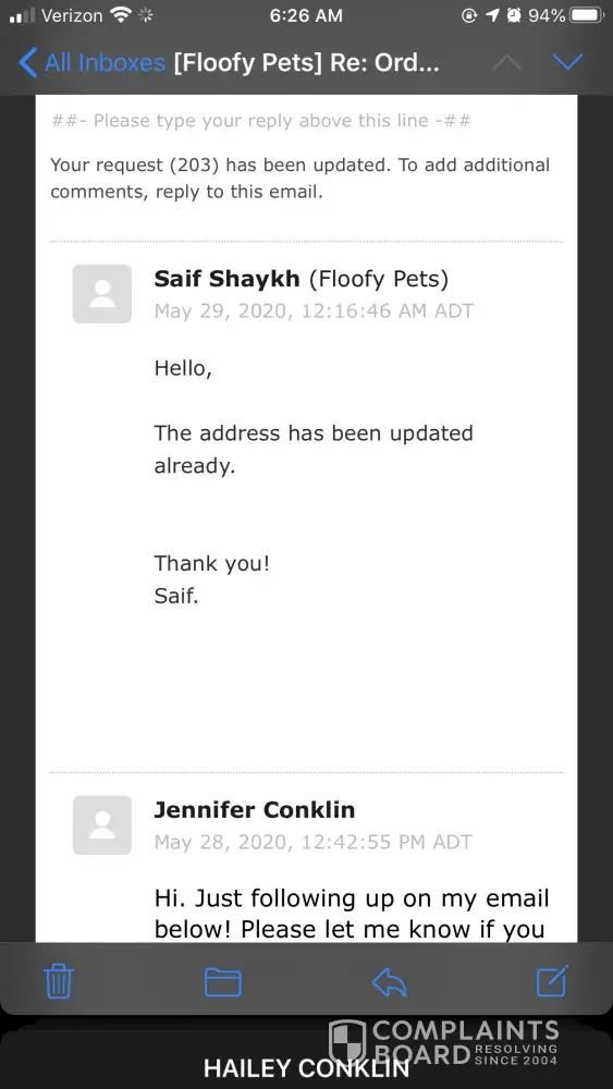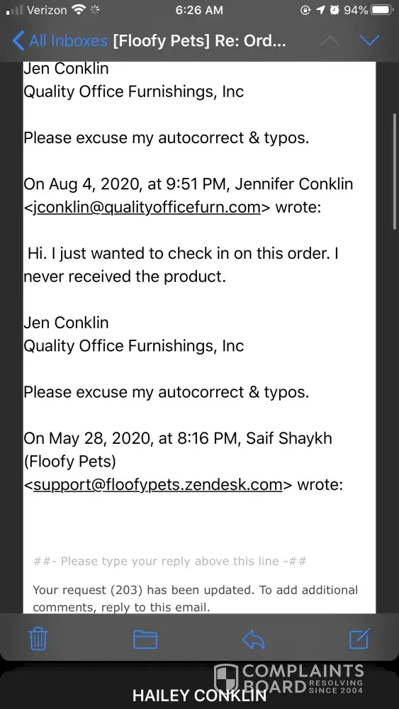 I have also commented on the company's Facebook page. Floofy Pets has never answered my emails or my Facebook posts.