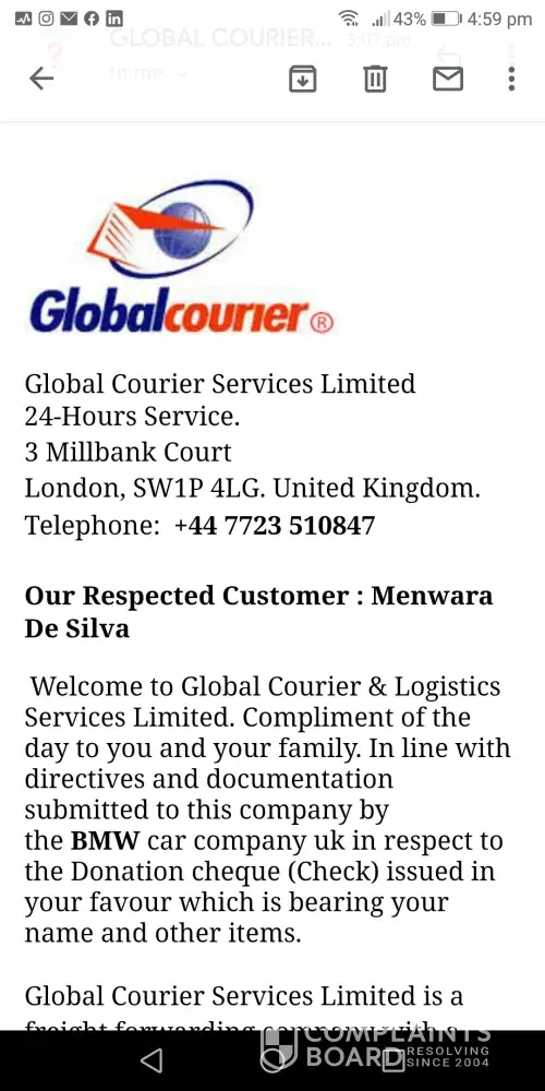 Attn: Identification Promo Code No PARCEL/NUM/1405, Welcome to Global Courier & Logistics Services Limited. Compliment of the day to you and your family. In line with directives and documentation submitted to this company by the BMW MOTORS PROMOTION in respect to the Donation cheque (Check) issued in your favour which is bearing your name and other...