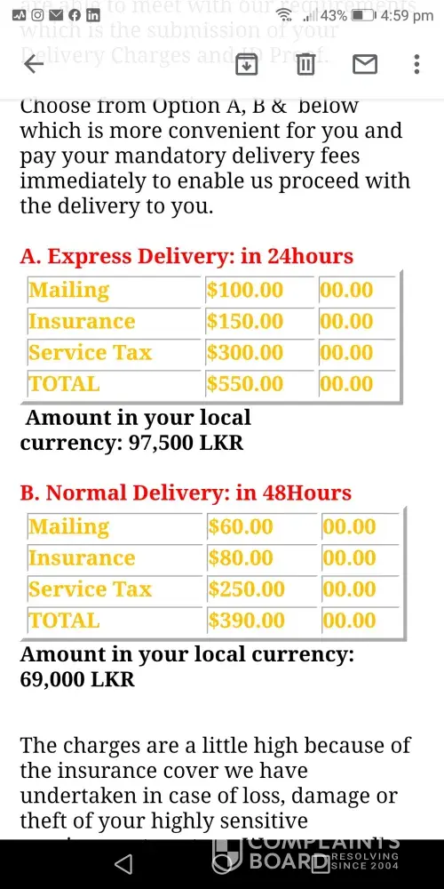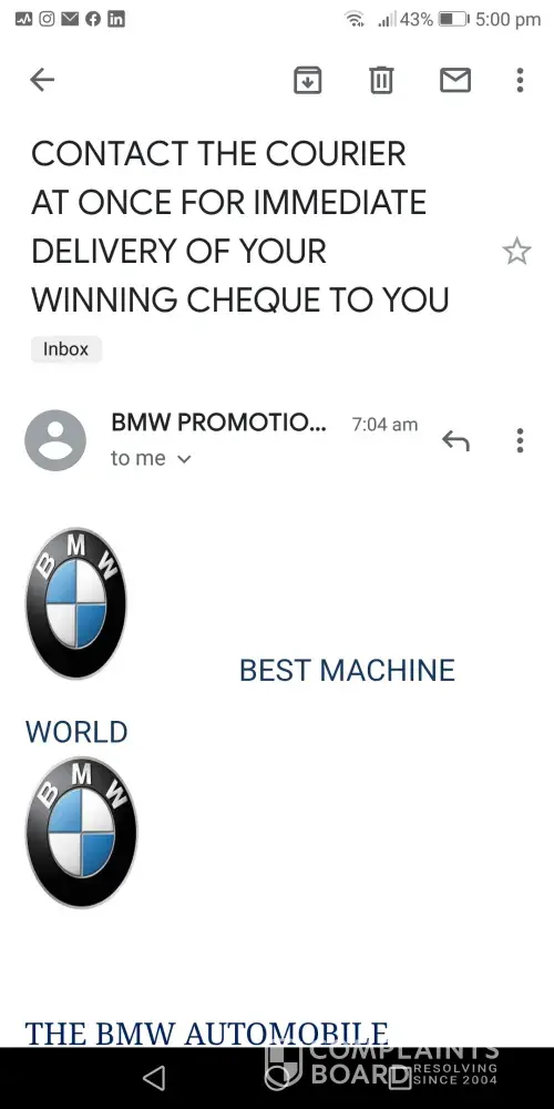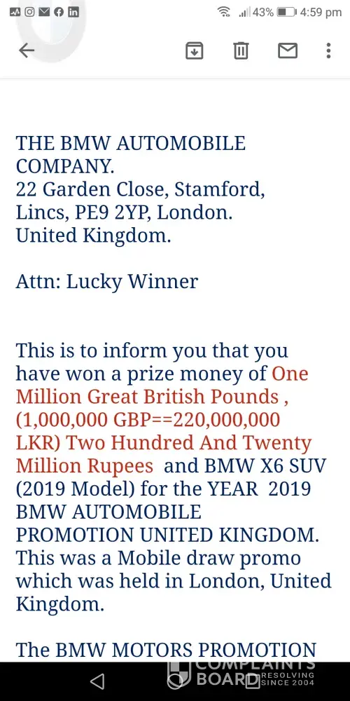 Hi I'm Menwara, I have recieved an email regarding a cash prize of 1000, 000 Great Britain Pounds won. This prize is offered by BMW UK. They have asked me to pay 97, 500/- LKR to the courier company as they need that amount to cover the insurance, service tax and mailing. It contains the Ref No.:DDGT-000679. I want to know if this is truly authentic in order for me to pay for the insurance coverage and other costs. Please help.