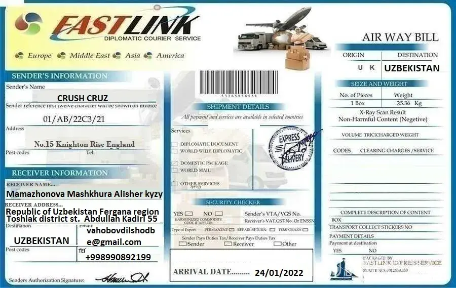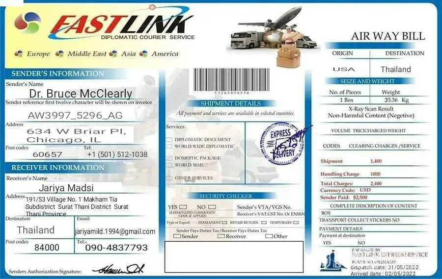 Please as soon as you make your payment scan and send the slips of the western union transfer to our email as an attachment file for record purpose. When your payment is confirm we shall be sending a staff to deliver your parcel to your house address.