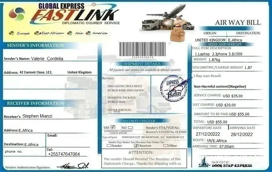 To help us coordinate and follow up your parcel and making sure that it is safe. Please madam you are highly advised to make your payment to the following staff information.
