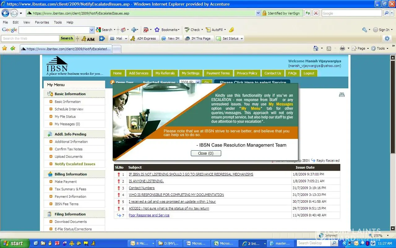 IBSN Tax- I am not able to trace my file returns and there is no sign of IBSN. I am unable to contact them. NOw since 5 days I find that their website is also not accessible. I doubt if they have filed my Tax returns. Now i am worried about the amount that they have charged me. can anyone let me know where should I go and complain?