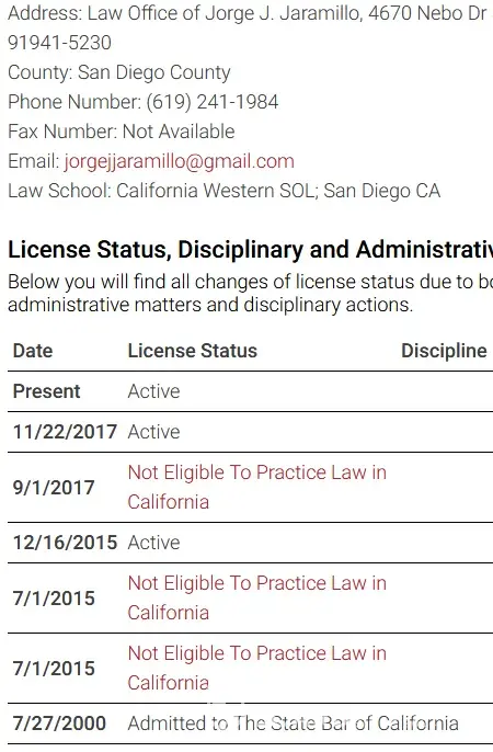 Now it looks like since Jorge Jaramillo retired in 2012 from the District Attorney, he has been suspended/prevented from practicing law a few times. See State Bar profile for Jorge Jaramillo, http://members.calbar.ca.gov/fal/Licensee/Detail/208122 or attached screenshot.