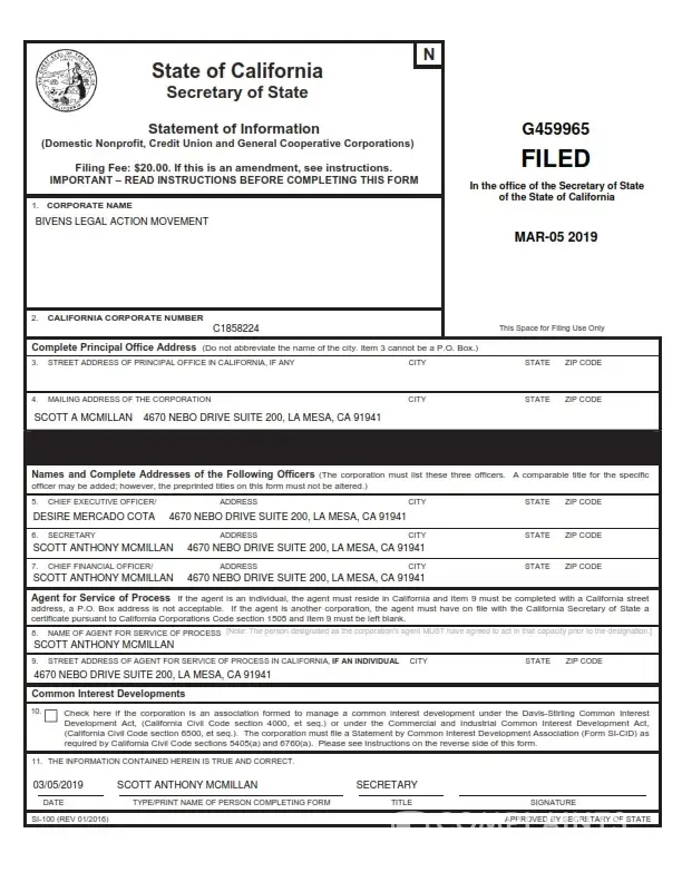 The california secretary of state shows scott mcmillan has actively used his law office address as the headquarters for the sue happy corporation whose mission is to sue the government: