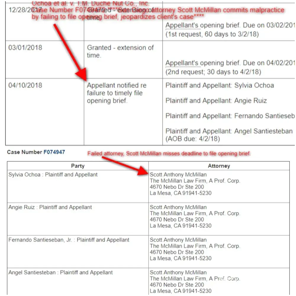 In 2019, scott mcmillan san diego attorney lost a huge wrongful death lawsuit in ochoa et al. V. Setton pistachio of terra bella, inc. Et al. Case no. F073978. The court said "plaintiffs [mcmillan] did not produce any evidence terra bella agland sold or otherwise placed in the commercial stream the east-west wet auger or other wet augers. (cf. Green, supra, at pp. 824, 828 [defendant sold defective crane].) without such evidence, plaintiffs cannot prevail on their causes of action for strict products liability…on appeal, for the first time, plaintiffs invoke the single-enterprise rule to impose liability on terra bella agland. This they cannot do."