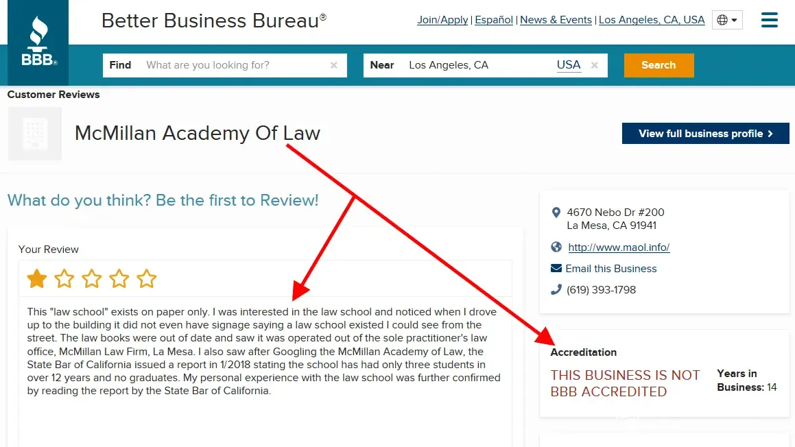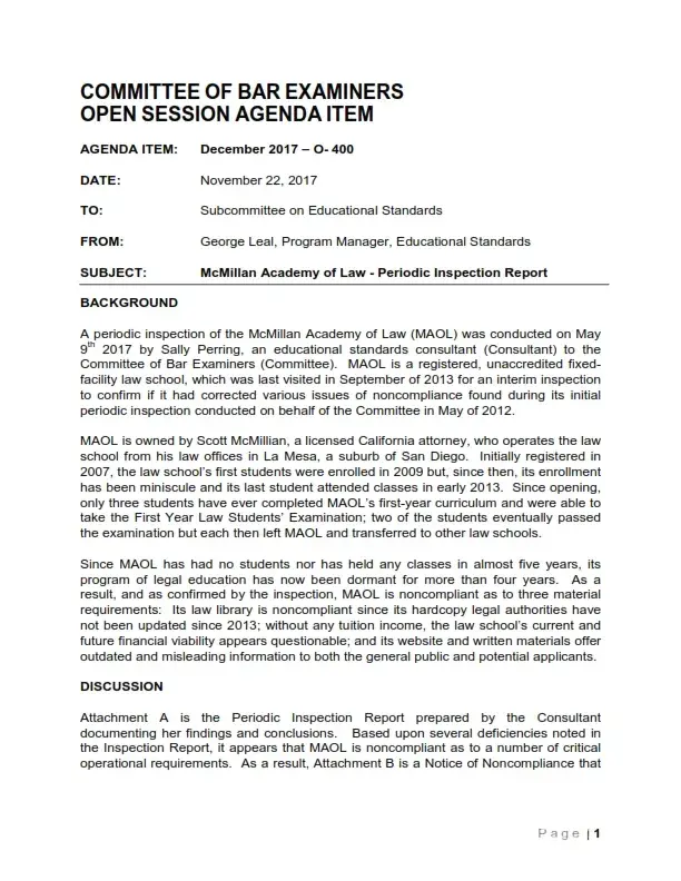 In 2017, the state bar of california issued a report calling the mcmillan academy of law, also operated out of his small office, in essence - a fraud. - the saying, "those who can't do, teach" may not be accurate. Scott mcmillan attorney in san diego opened his own law school in 2007. During the last 10 years mcmillan academy of law has not graduated a single student, and in 10 years has only had 3 students - yes that is right 3 students in 10 years. Scott mcmillan serves laughably as the law school dean, and professor to none.