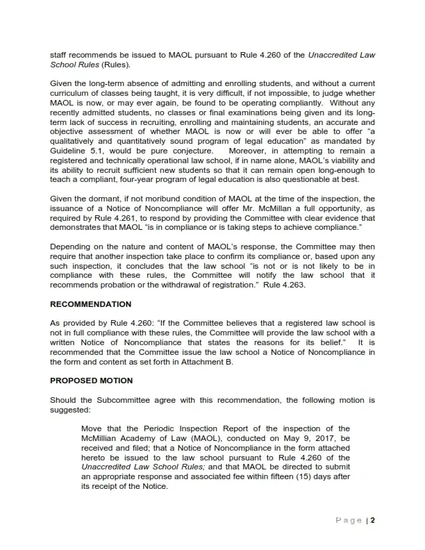 "Since opening, only three students have ever completed MAOL's first-year curriculum and were able to take the First Year Law Students' Examination; two of the students eventually passed the examination but each then left MAOL and transferred to other law schools. Since MAOL has had no students nor has held any classes in almost five years, its program of legal education has now been dormant for more than four years. As a result, and as confirmed by the inspection, MAOL is noncompliant as to three material requirements: Its law library is noncompliant since its hardcopy legal authorities have not been updated since 2013; without any tuition income, the law school's current and future financial viability appears questionable; and its website and written materials offer outdated and misleading information to both the general public and potential applicants."