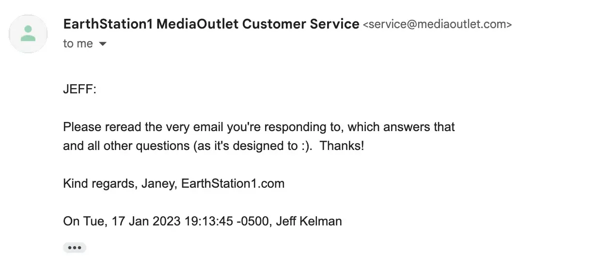 I ordered a DVD in December, and emailed in early January related to a specific DVD that I was looking for. I was excited for this as I am a historian and would find value in the DVD that only they appeared to have. Unfortunately, when I emailed service@mediaoutlet.com and only many days later got a response from a "Janey", was I about to learn what this hell hole is really all about. I proceeded to get insulted over and over, and told to just read some "FAQs" instead of their customer service merely answering questions about my order. They have been caught in lies over and over again as well, telling me that the order was shipped, and then later that it was cancelled. Well you can't have your cake and eat it too Mr. J. C. Kaelin. Either you shipped the DVD, or cancelled the order. Either way, they have told me conflicting reports on numerous occasions. I always strive to be professional, and even have worked in customer service myself in numerous roles over many years, and I haven't found it in my interest to write negative reviews for many years as well, but this MediaOutlet.com company is so bad, that I need to make an exception and hopefully help someone else out in the future. They even personally insulted me. I said in exasperation to one email they sent, yet again deferring me to the FAQ, "You're killing me smalls", to which they proceeded to BLOCK my email! Blocking a customer's email! Unheard of! Buy from Amazon, eBay, or any other major spot. I then still needed an update, so I went to another email address after being BLOCKED for saying "You're killing me smalls" (really nothing out of the ordinary! some light humor I felt!), they proceeded to respond saying, "Become a better person, for your sake and that of everyone you deal with." Who on earth says that? Well apparently "EarthStation1 MediaOutlet Customer Service" does. Take your business elsewhere.