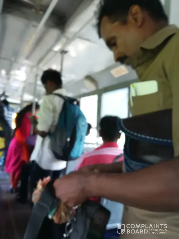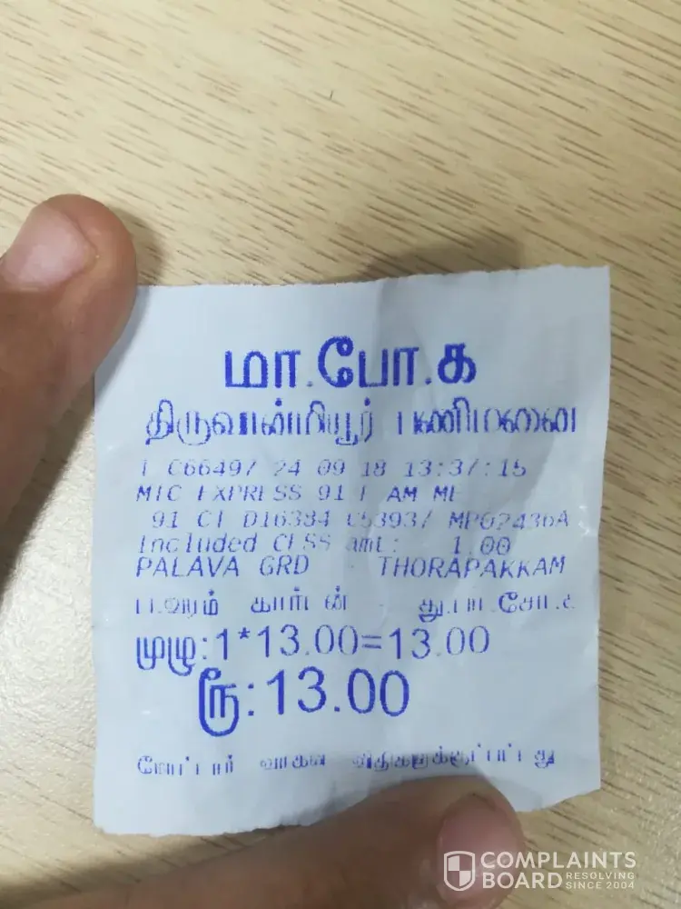 Today I have boarded 91 bus (tn01 n 9634) from vels university stop (chromepet) to chennai one (thoraipakam) at 1.32 pm. As soon as I boarded the bus, I was waiting to get the ticket as I dont have change I gave 50 rs for which conductor spoke rudely and asked me to get the change, if you dont have change get down (change vangitu mela eru, ilena next stop la erangidu). Again I was standing firmly then he got my 50 rs and refused to give the change even though he was having change which he got from other passengers. Also when I asked about my remaining change, he told will give you only at the end of the stop. I asked him he can give the change which he got from other passengers, for which he said you go and get and come from them why should I do? (ni venumna avnga kita change vangi enaku kudu, na yen vanganum) also he gave me the ticket for 13 rs (pallav garden to thoraipakkam) whereas my actual fare was 12 rs (vels to chennai one), when I enquired about this he said, you should ask and get properly. (ni olunga chck pani vangi irukanum, enala la paka mudiyathu) I was shocked, as its his duty to give the proper tickets. Also his way of talk, behaviour was very rude. He started calling me as va, po, next stop la erangu, ni vangu, etc.. He din give basic respect to elderly people or to anyone. I feel much offended by his behaviour and need action against this, so that it wont continue in the future with any other passenger. I have attached the bus ticket and the conductor image where he was holding the change in one hand and rupees in other hand, yet he refused to give it to me unless I reach my destination.
