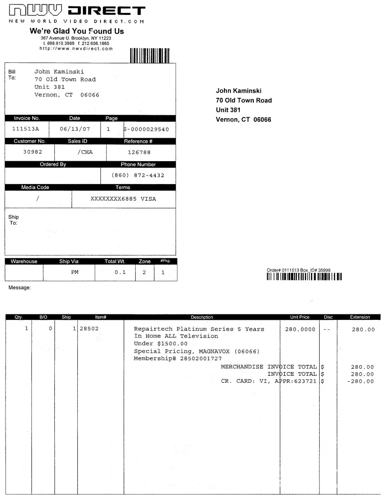 Daughter & son-in-law ordered a refurbished TV from NWVDIRECT.COM; it was given to me as a birthday gift. Inside packaging was flyer to purchase a 5 year extended warranty. I used my VISA credit card over the phone and purchased the 5 year extended warranty. New World Video sent me an acknowledgement of my payment of $280 to them for the 5 year extended warranty. The TV worked fine until a month ago when I phoned NWVdirect.com and told them I had an extended warranty; they advised me that they do not sell extended warranties and to google Repair Tech for their phone number. Repair Tech is a scam and no longer in business. My payment was sent to NWVdirect not to Repair Tech. I believe NWV direct should return my $280.