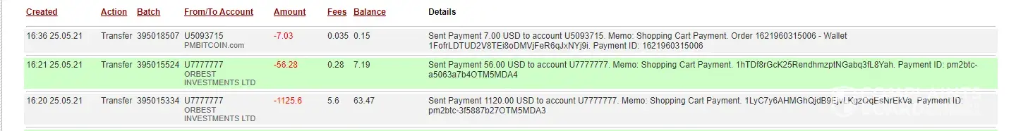 ORBEST INVESTMENTS LTD -254.97 4.975 90.15 Sent Payment 250.00 USD to account U7777777. Memo: Shopping Cart Payment. 1JdcecEGkgc52VUkqtjCGrvedyCpZAt3ra. Payment ID: pm2btc-315051