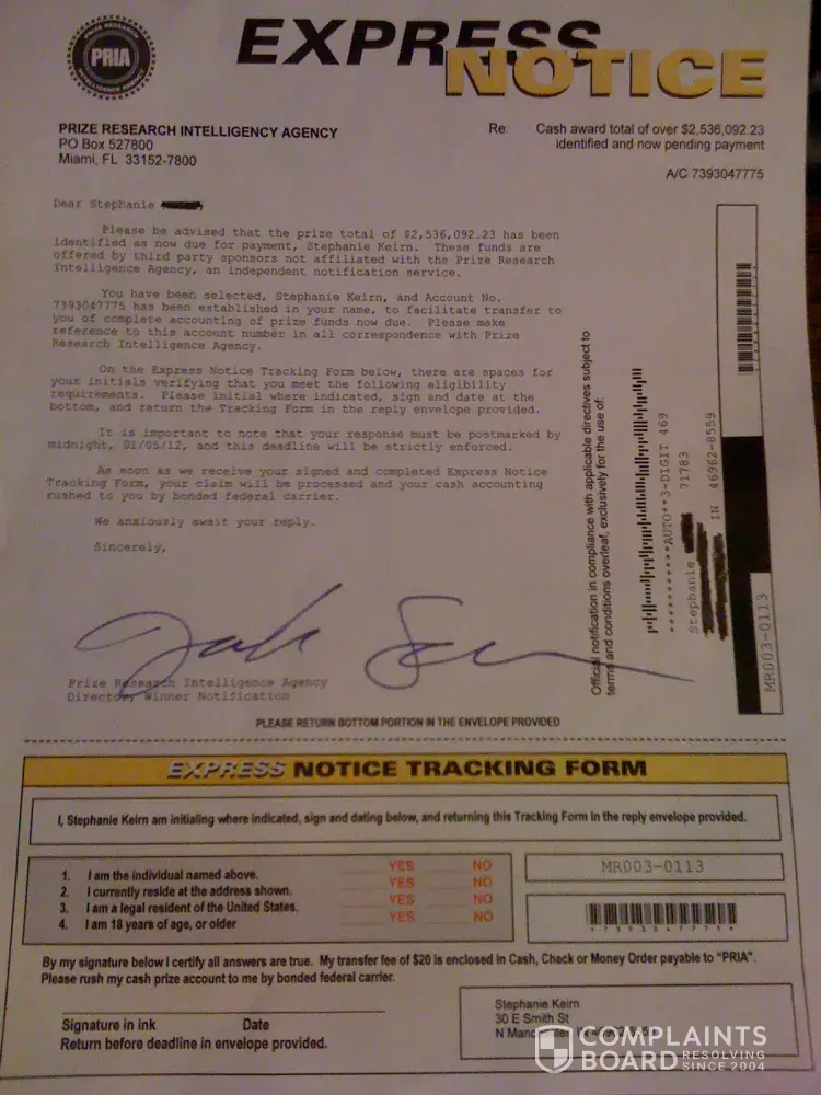 the same letter came to me today, my question is... they have to have a bank account for "pria" or "prize research intelligence ageny" so why is it so difficult to lock them up, with the mail fraud it makes it a felony to boot..?