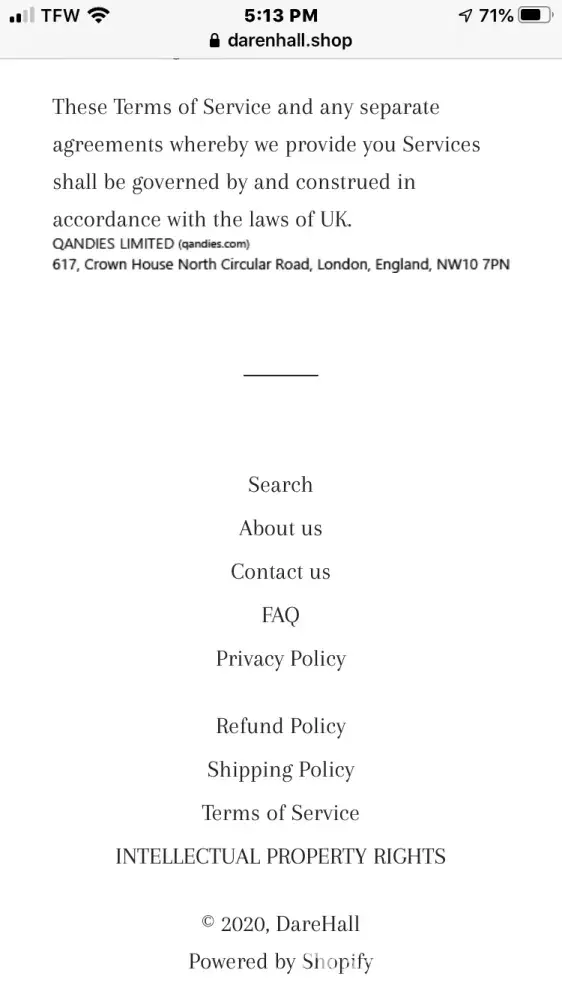I ordered an item from DareHall.shop from a Facebook advertisement. After research, Qandies Limited is the registered owner. I have sent several emails to inquire about the location of my item. I ordered on Jan. 13, 2020 with a shipping date of 10-12 days. I received one email from them giving me the tracking information, however, after further research the tracking company turned out to be a false or fraudulent site. Beware! This is a scam!
