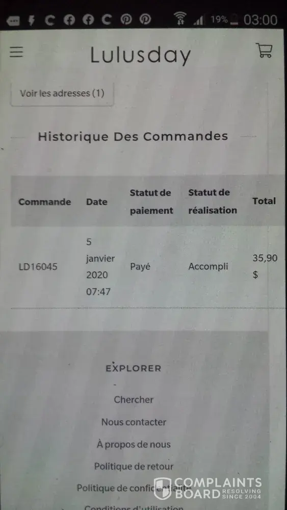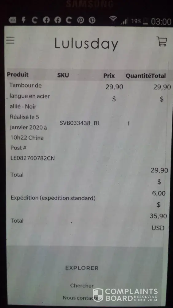 il y a eut une pub sur facebook de la vente d'instrument tong drum black sous la dénomination " lulusday " une fois payé 35, 90 usd vous ne recevez jamais ce que vous avez commandé n° de commande ld16045, ne répondent pas aux mails. l'escroquerie est avérée, j'ai reçu une minuscule serviette en éponge à 2, 50 euros