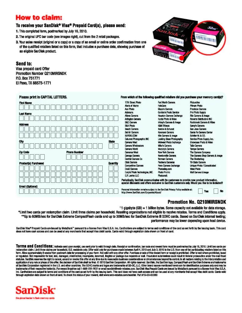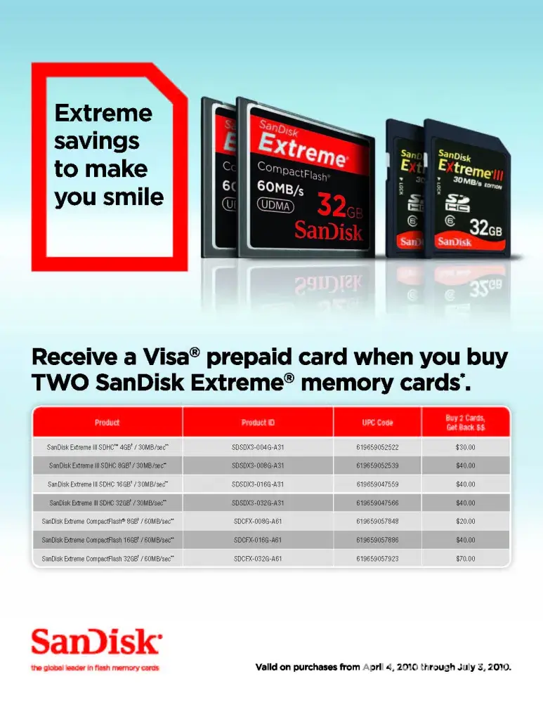 Sandisk had a rebate for purchasing two memory card. So I purchased two at Adorama 8g and 16g both 32mb/s. Now I got a post card from Sandisk saying I did not meet the purchase requirement as stated on the rebate form. I called them at [protected] to find out why? Apparently I have to purchase two of the same card. The cards were listed on the rebate and on the same grid dollar amount. Bought at one of their listed authorized seller. No where on the rebate form did it say I have to purchase two of the same card. I asked to speak to a supervisor which was a waste of time cause they don't have power to approve anything. All they could do is send it to accounting department for further research aka passing the dam buck. Don't fall into the promise of a rebate to purchase their product it's a scam they will find a way to deny it.