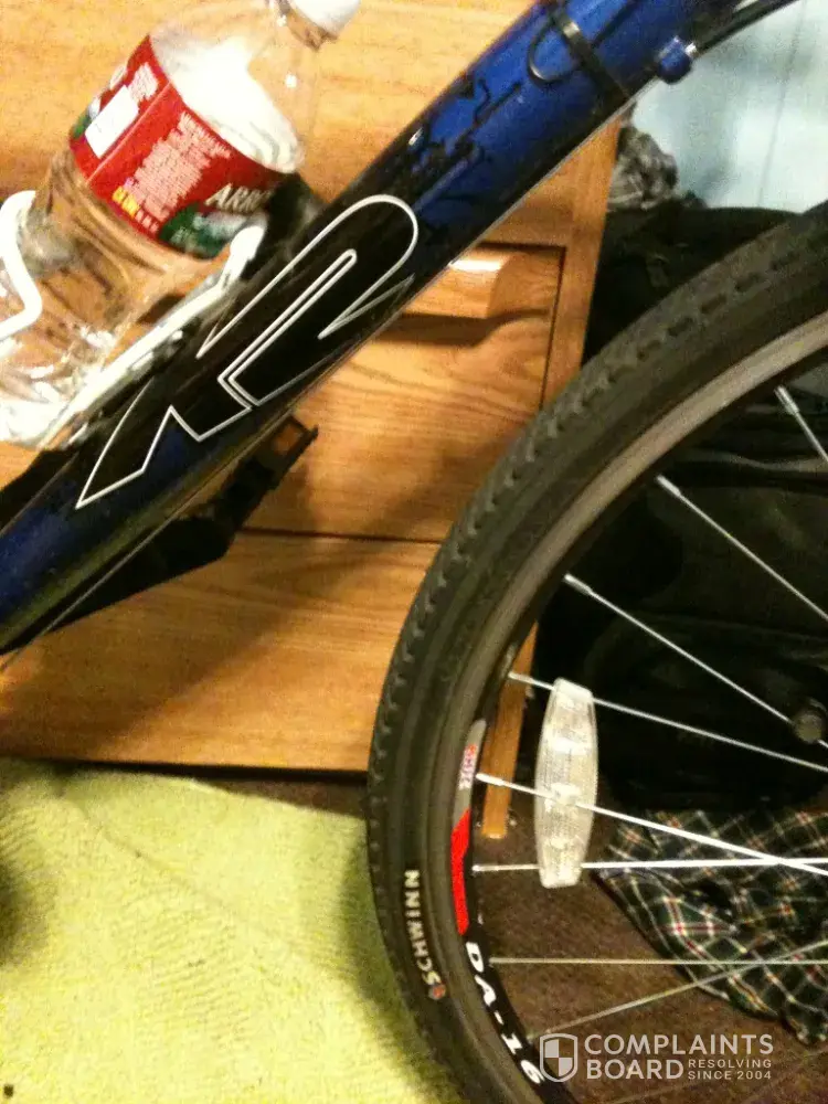 I purchased my K2 Astral 2.0 bicycle at Sports Authority on Saturday, April 16, 2011. Today is Friday, April 22, 2011. On sunday night, I noticed a residue on the sidewall of the front tire. I thought it may have been the SLiME that I had the tech install into my tires. I tried rubbing it off with my fingers. No dice. I then thought it may have been permanent marker, which I know (from experience) is alcohol soluble. I grabbed an alcohol swab and wiped off the permanent marker. What was the permanent marker hiding, you may ask? It was hiding a Schwinn logo. The bike is a K2 bike, with a Schwinn tire. I thought I would ride my bike 9 miles to the Sports Authority store where I purchased the bike. I brought it into the store, and talked to a manager. He told me that Schwinn manufactures tires. Not only is that false, but that was a coverup. Both front and back tires have the same tread pattern and are manufactured by Innova. I then realized hat the rear tire is alright, according to K2's spec sheet on their website (700x35c), while the front tire (with the covered up Schwinn logo) was incorrect according to K2's spec sheet. It was a 700x38c. I spoke with another manager (all of the sales employees seem to have tags with the "Sales Manager" title) who told me that there was a Schwinn branded tire on it because Schwinn is a quality company, and they want people to think that the bike is of quality. This is not true, because if they wanted people to think that the bike was of quality, they wouldn't put it on just the tire, and they wouldn't cover it up with permanent marker. I had to wait for a tech to arrive to adjust my front derailleur. When the tech arrived, I directed his attention to the Schwinn branding on the tire, and the incorrectly sized tire. He went to check the K2 Astral 2.0's that they had on the floor. He was about to take the tire from a floor model and put it on mine, but the manager (the second one I spoke with) asked him what he was doing. He said "I'm not sure he has the correct tire." The manager said "oh. He /has/ (backslashes added to simulate italics) the correct tire." I had a mortified look on my face. The manager said to me "We'll look at the tires when you come in for your 30-day tune up." And I left. I was extremely dissatisfied with the service I received there. I will be going back with my father (I am 15 years old) tomorrow, Saturday April 22, 2011 (exactly one week after date of purchase).