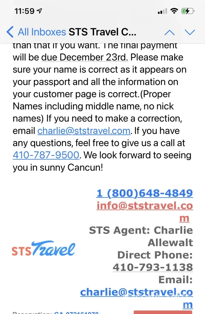 I am President of Student Travel Services (www.STSTravel.com), www.STSVacations.com and www.AllInclusiveResorts.com . I am posting to clarify that there is no relationship to the above Company. We are a Maryland Based Company with an A+ rating with the Better Business Bureau. If you have any questions, please feel free to contact our offices at [protected].