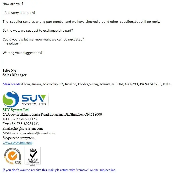 Be careful of this company. We inquired a hard to find part and they quote us shortly with a good pricing. We decided to take this part and sent a PO. The supplier provide proforma invoice and ask for prepayment (because of first transaction between us). So we have made our payment and waiting for goods to be delivered. After 3 weeks they wrote us that they received a wrong part number and that they are now checking other suppliers. We asked them to cancel the PO and refund the amount. All has been communicated with Echo Xie - Sales Manager. Since nothing happened from our last email I checked SUV Systems Ltd for some references and found similar stories like ours. Be careful and do not make your payment in advance! I am attaching a cutting from email they sent to us as a proof of above written. This issue is dated 09/2014. I will add a comment if any change.