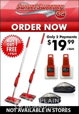 I also ordered the swivel sweeper which came with a free mini sweeper for $39.98. I was to also get a free swivel sweeper and mini sweeper. I ordered a extra battery for $14.99. Boy was I surprised when my order arrived and my billing statement was for $54.97 plus $35.97 S/H for a total of $90.94. The sad part was that the sweeper didn't clean as advertised on TV and the batteries never held up long enough to even clean one room. Now I have 2 swivel sweepers, 2 chargers and 3 batteries and none of them work.