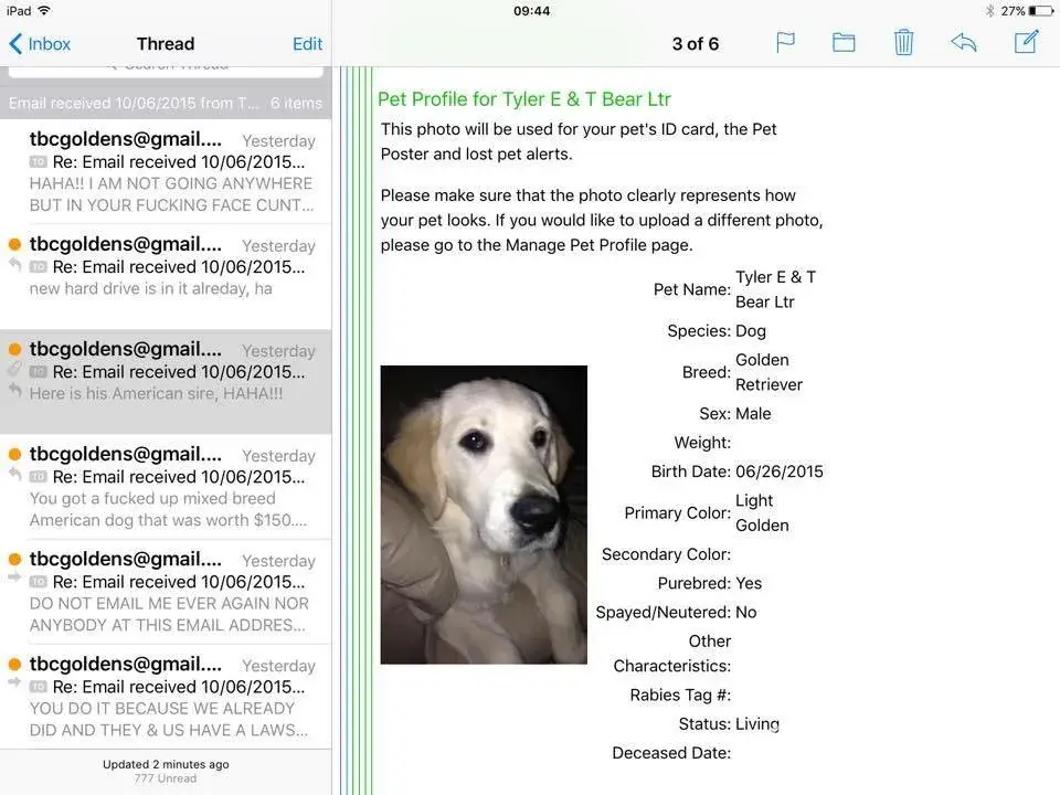 These are screenshots of some of the emails, admission of fraud sent to me by this breeder two days ago. The picture of my dog