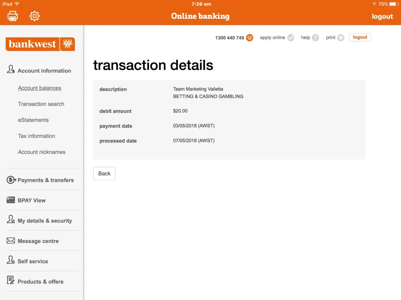 Ive just logged into my internet banking to find two lots of $20 been taken without my consent or knowledge from Team Marketing Valletta Gambling. Please explain why i need my money back please. I do on occasions use my card for online gambling but I have not used it today at all and I am at a loss to why two lots of $20 has been taken out I struggle enough as it is and im bit upset to be honest. Losing faith in humanity can't trust anybody.