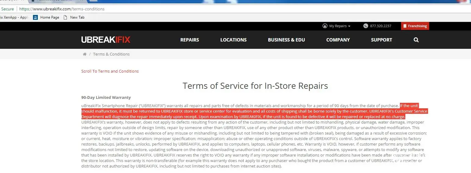 He put me on a brief hold and then came back after allegedly speaking to the store franchisee. Daniel told me that the franchisee was "adamant" about keeping the phone and that I gave up the rights to it by accepting the reimbursement. At no point did I verbally agree to that nor did I ever sign off on such an agreement, I replied. Daniel then told me that the UBreakIFix website has it in their terms and conditions that in the event such a situation occurs, the company can keep my property.