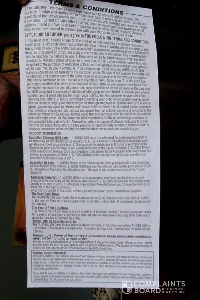 I have received letters by the galore to enter in so many draws. The more you enter the more you pay. It starts with a registration fee with free numbers, the problem is I have never known my numbers. Then they keep sending more letters to keep buying in to the lottery draws. As the draw nears, they ask for a registration fee to be part of the distribution of the large lottery win AUS 21, 000, 000.00. The closer the draw is, the more the registration fee. The last letter was for $150.00 AUS. You can ring, fax or send cash or ring a number. There is no website to access nor are you able to use email. Cunning as these cannot be tracked. In the last mail asking for the $150 registration to have a share of the winnings that are to be distributed they put that payment must be made in 72 hours. This makes you think oh, I must do it or i'll miss out. I just threw it in the rubbish. When they ring to ask if you would like to go in the lotto draw drawn either on that day or the weekend they are to send your numbers by email. I did it once for $24.95 and waited for my email it never came. When they rang again, I told them I did not receive my numbers in email and I will not be buying any more. The person quickly hung up.
