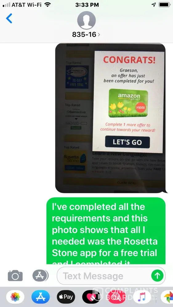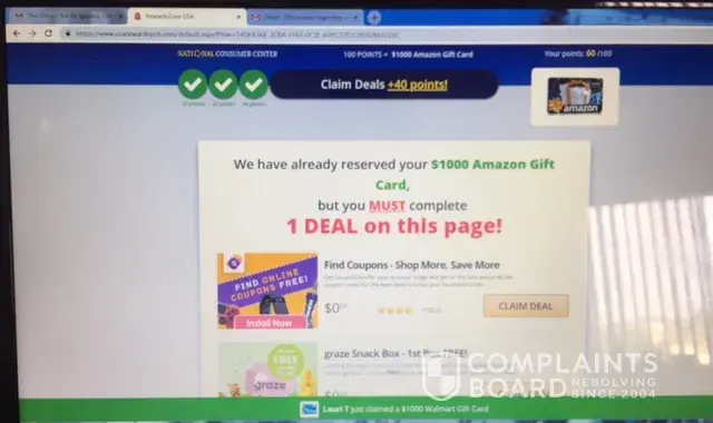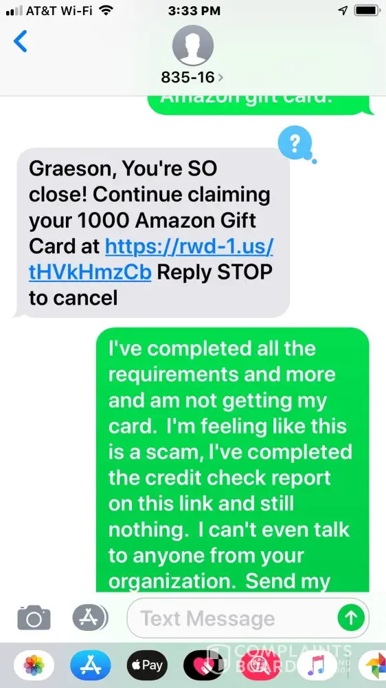 I've done countless surveys for Amazon cards and followed through with everything I was supposed to do $4, 000 Walmart cards 2000 dollar amazon cards I'm sick of doing these surveys and not receiving what I'm supposed to receive and paying out this money for nothing for little books for whatever what have you credit reports and all this other stuff I'm tired of it I want you to either send me my cards I'm going to pursue a lawsuit