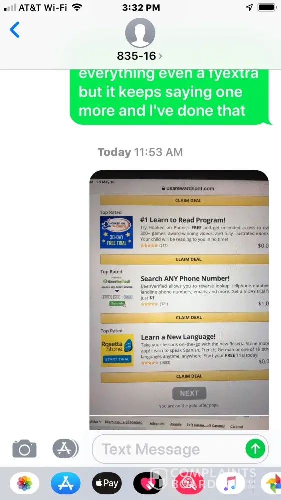 They keep texting me from a strange number 835-16 asking me to share it with 5 friends, trying to scam my friends and myself. I'm including pictures of the texts and offers I completed all for nothing. They need to be held accountable and fulfill their legal obligations. I ended up spending money for nothing. The companies that are being used need to do something to put an end to this scam.