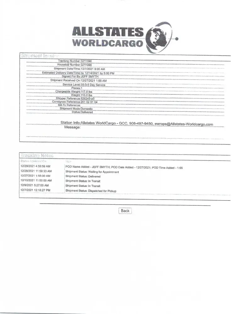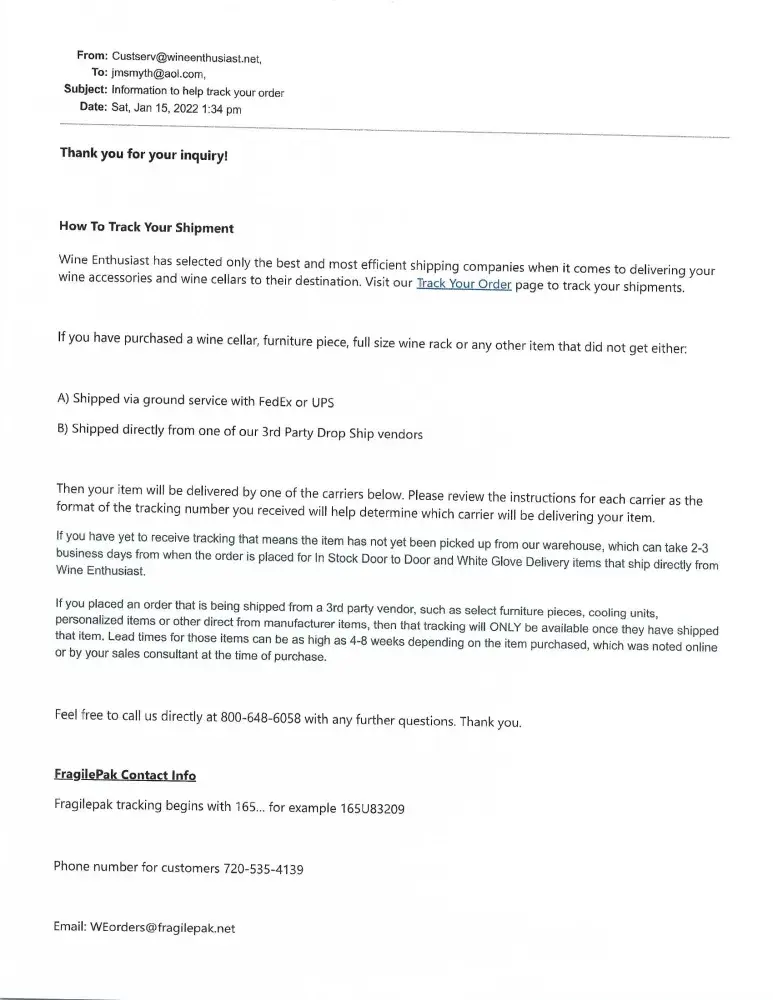 Ordered fridge on 12/7 under order #526243 and was told 7-10 delivery. Fridge finally showed up on 12/27, attached receipt. Upon opening the box, it was found that the top of the door at the hinge was broken, our email attached contained the pictures. Attempted to contact Wine Enthusiast via phone their various 800 numbers but those are useless as there is an answering service that takes down your name, contact information and promises a response within 24 hours, which never happens. Their customer service 800 number actually directs you to send an email [protected]@wineenthusiast.net and allow 4 days to respond, which we did, attached, but you receive a standard response email, attached, directing you to the various delivery companies to follow up on your shipment status which doesn't do you any good when the product has already been delivered. Would not recommend anyone to do business with this company that I would want to remain friends with.