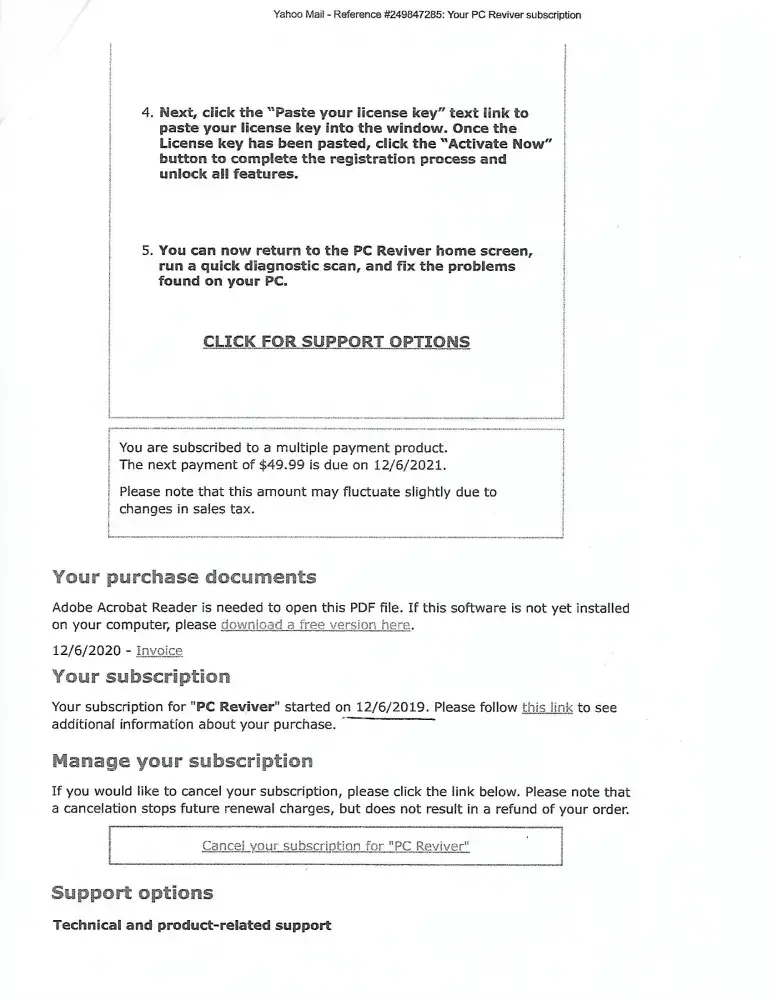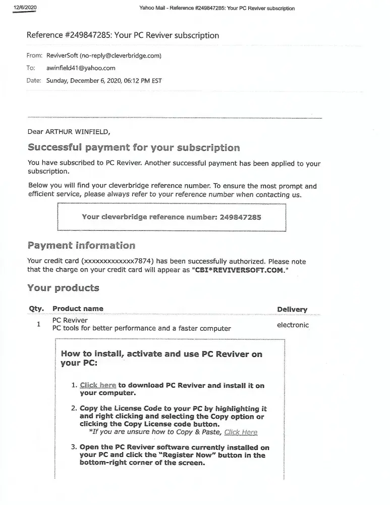Today is Sunday 12/06/2020 I received an invoice today for $49.99, from a company I have never heard of before Reviver Soft. They say I ordered this on 12/06/2019. Under the heading: Your subscription. By clicking on this link tells me to delete the old download, after deleting, download the new file. I have never even downloaded this file so how can I delete what I have never had on my computer. I am going to my bank in the morning as I believe this is a fraudulent scam. I have to report this to my bank as it is a debit card, I have to request a new one. Please Find enclosed a 3 page file of this invoice.