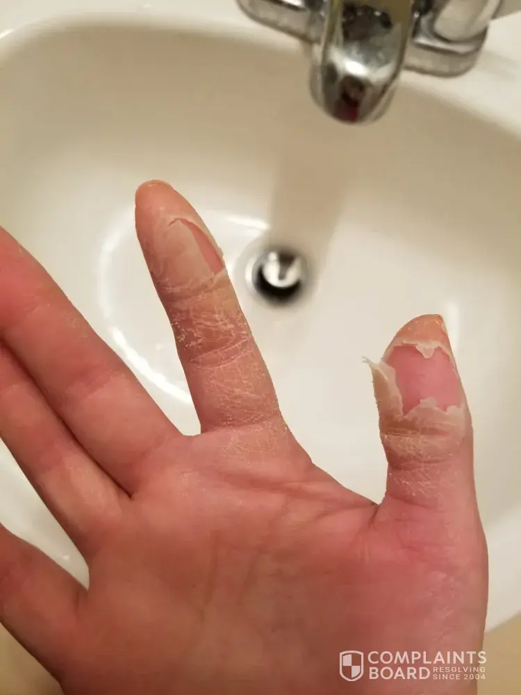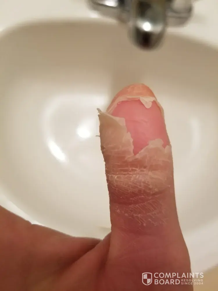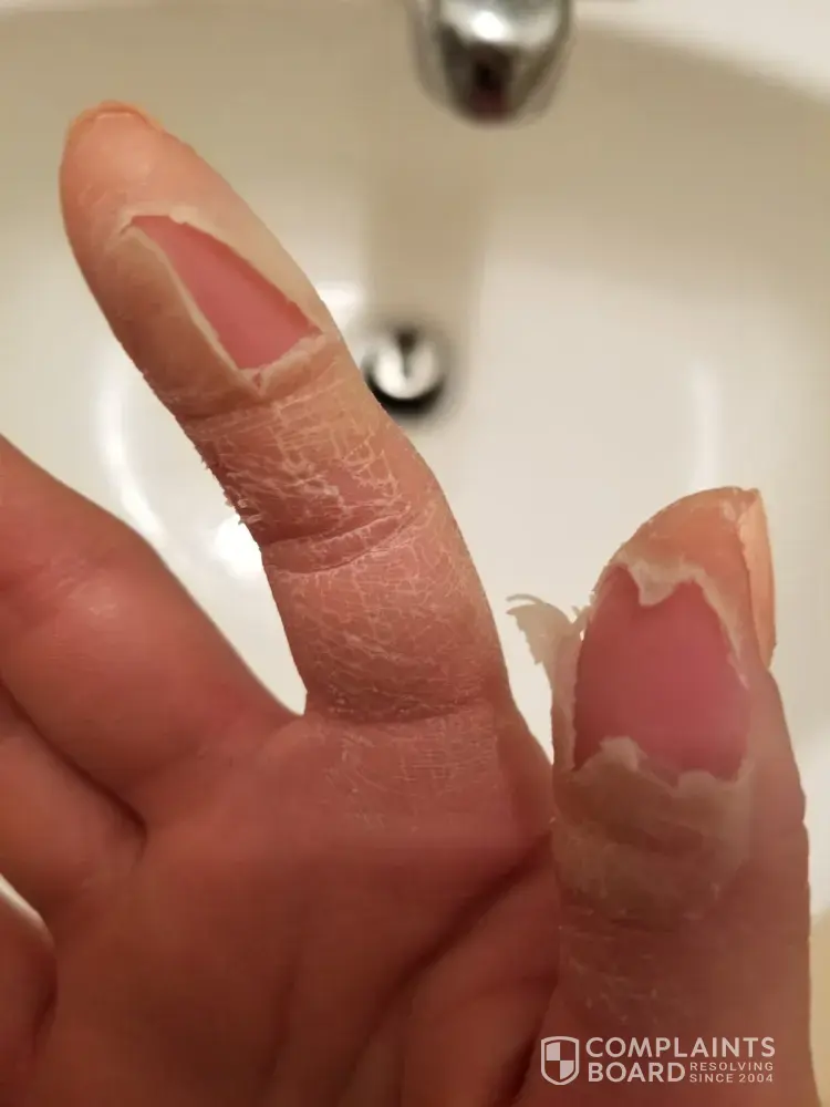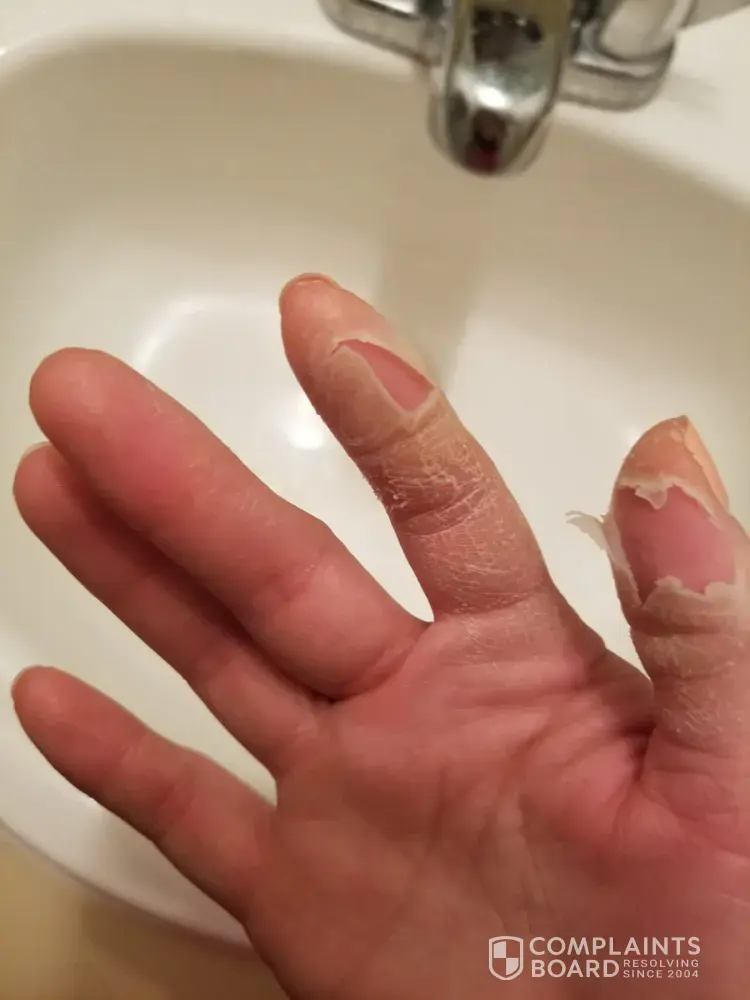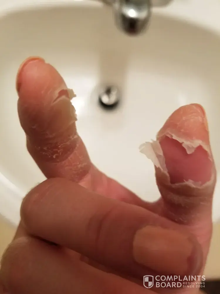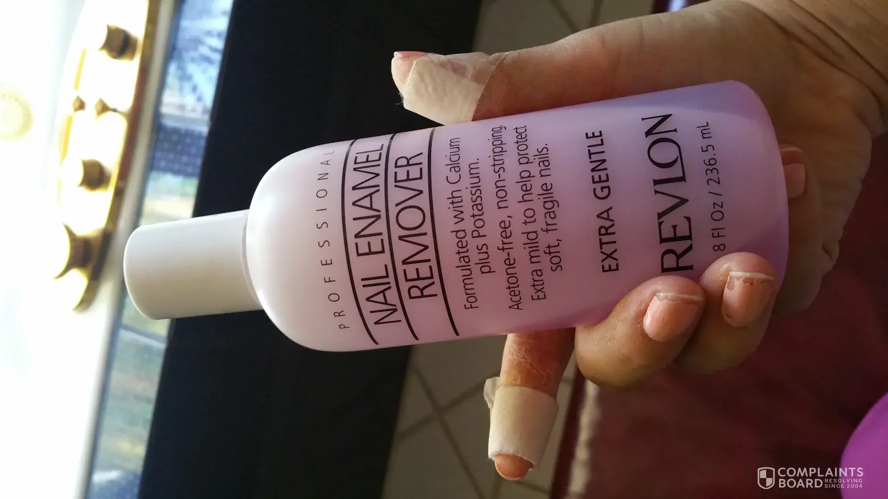 I tired the revlon nail enamel removal "extra gentle" and the product dried my finger skin so hardly that my skin started to stretch and peel off . I already sent an email to the customer service but they haven't responded jet. I have to use a glove at work and home in order to protect my fingers from physical contact because it hurts so much. I'm still waiting for a response