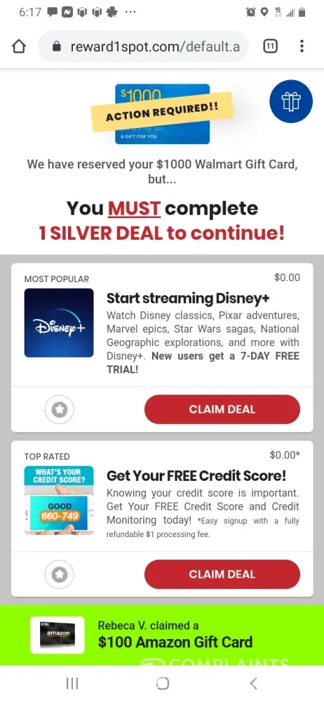 Reward Zone USA offer to receive $1000 Amazon gift card. I got to the last step and then I signed up for the Disney+ service. But then nothing happened. I did not get the reward! I have gone through the procedure twice. It did not work either time. I've done EVERYTHING asked of me, but I have not received any reward! Please help resolve this issue. [protected]@gmail.com