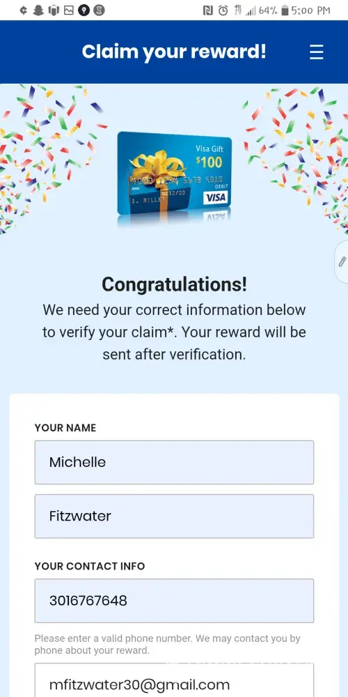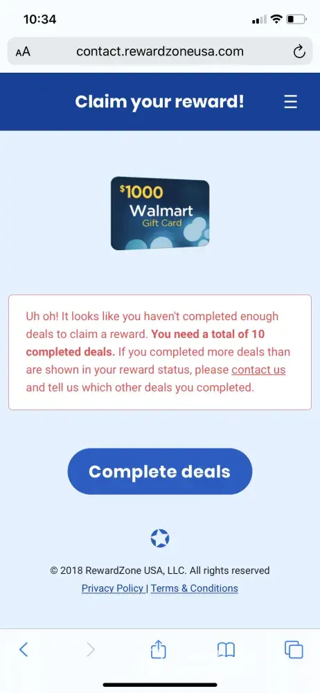 I completed everything that was suppose to be completed in order to get the $100 Visa Gift Card. But every time I'd try to claim my reward, it just pops up saying, "http://contact.rewardzoneusa.com/claimincentive says Error.