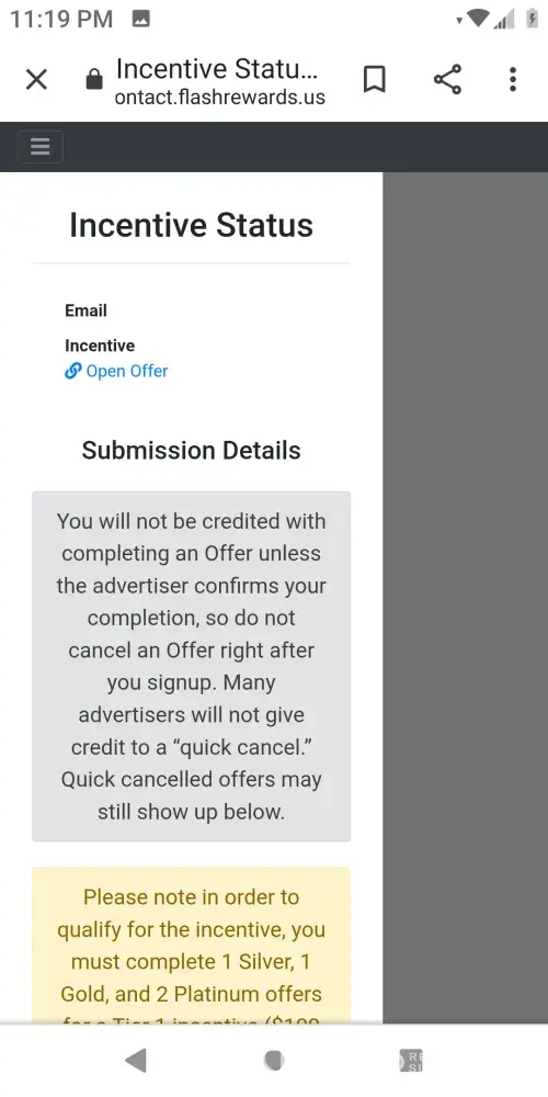 I have completed more than 10 incentives (after reaching the platinum level, I kept refreshing to see if it would updated my reward status and it took me back to a previous level. So after doing more offer a from that level, I reached platinum again and low and behold the previous offers I did are now platinum offers and don't count towards my reward. and still have not received my gift card. I have emailed the company 3 times and have not heard a word back. Now I'm subscribed to all this stuff I don't want or need. And now it's probably been more than 30 days dealing with all of this. No reward in sight! This is wrong.