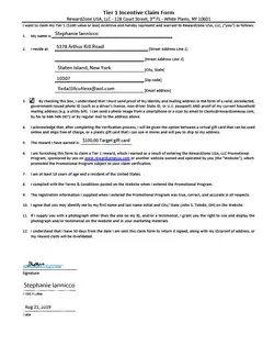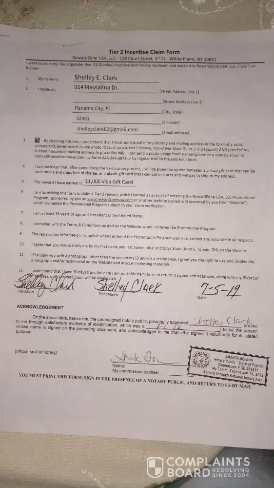 Beginning on June 19, 2019, I entered the RewardZone, USA, LLC promotional program online, and over a period of several days completed all the necessary requirements for a Tier 2 Reward of a $1, 000 Visa gift card. I followed the steps for submission and when the verification process was complete, on July 2, I received a"Congratulations" e-mail stating there was one more - total of 3 - step to claim my incentive. It contained a "Tier 2 Incentive Claim Form". I completed the form, signed, had it notarized and sent it along with the requested proof of ID and address to the White Plains, NY address on July 5. It said, once submitted I would receive my reward within 3-6 weeks. I have never received any form of acknowledgement, as stated in the attached verification e-mail and no gift card as promised. I've spent several hundred dollars on products and services purchased in order to earn this reward. I made 2 follow up attempts and still no response. HELP!